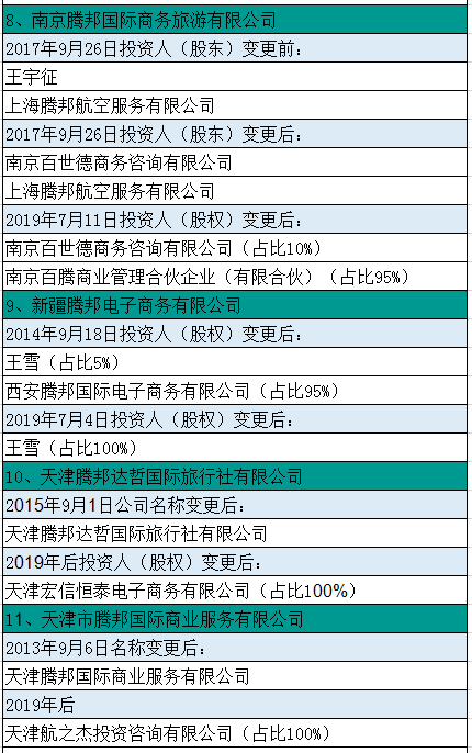 劲旅君仔细分析发现,上述11家企业有两大特性,其一,大多数企业是在2015年左右被纳入腾邦系;其二,大多数企业的主营业务都有航空票务。