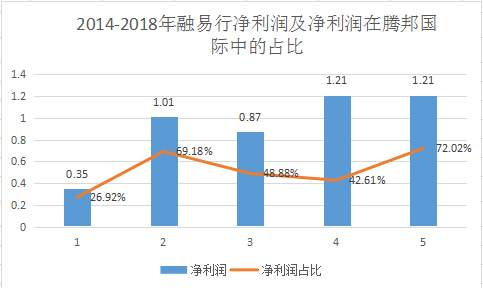 融易行2014年至2018年净利润分别为:0.35亿元、1.01亿元、0.87亿元、1.21亿元和1.21亿元。腾邦国际2014年至2018年净利润分别为:1.3亿元、1.46亿元、1.78亿元、2.84亿元和1.68亿元。融易行历年净利润占据腾邦国际26.92%、69.18%、48.88%、42.61%和72.02%。
