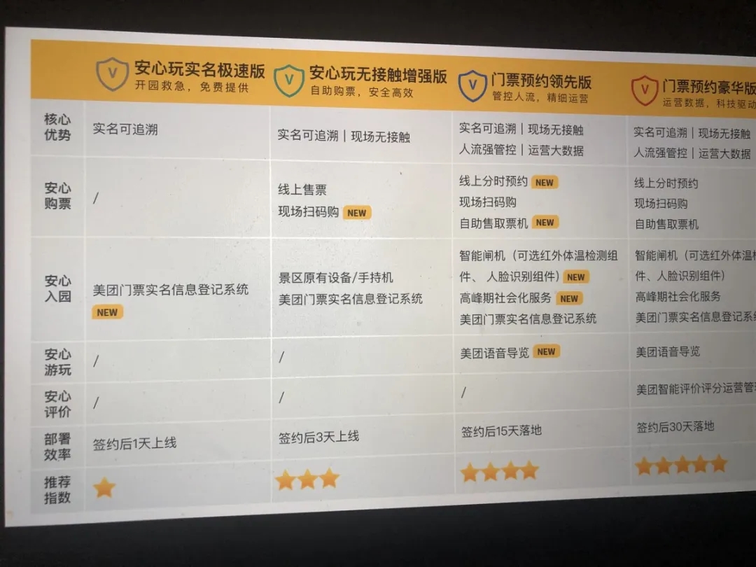 今日,劲旅君获取内部消息称,美团门票正在尝试推广一套针对景区行业实名登记、网络预约售票的综合服务解决方案。这套方案总共分为四个版本并被命名为:安心玩实名极速版、安心玩无接触增强版、门票预约领先版和门票预约豪华版,分别针对不同的景区。
