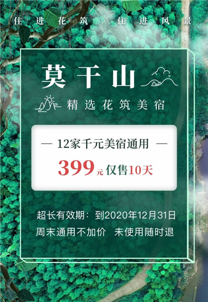 极具诱惑力的价格,加之全额退订的可靠保障,使得花筑民宿酒店预售套餐一经上线便大受欢迎。近期,花筑还将陆续上线莫干山、安吉、黄山、华南、华北等地多店通用的超值预售产品。