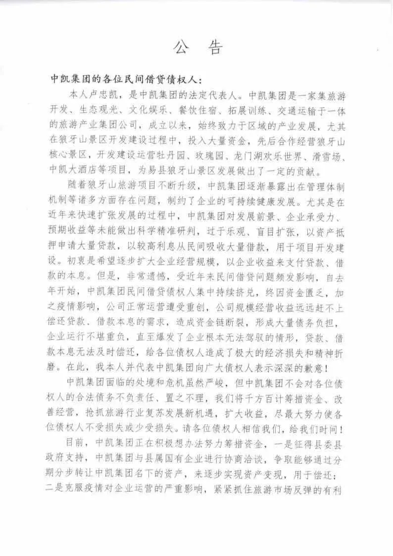 2019年11月,中凯集团向易县县委、县政府提交了《关于恳请县委、县政府支持中凯集团妥善处理债务危机的申请》。