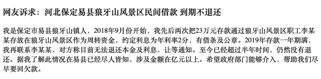 卢忠凯和中凯集团不仅向一些民间有实力的人大借贷百万、千万级别的资金,几十万规模的资金也不放过。有狼牙山镇人士2019年在网络上举报,自己2018年9月开始,将23万元分两次借贷给狼牙山景区职工李某某,作为景区周转资金,约定利息为年利率2分,借期1年。但景区逾期半年后一直未偿还。