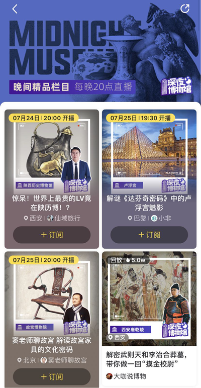 与其他博物馆类直播不同的是,“深夜博物馆”往往不会像导游一样走马观花地进行介绍,而是会针对具体的某个主题,几件甚至一件藏品进行深度讲解。“年轻游客越来越在意旅行背后的文化内涵,他们对于文化内容的需求,也不仅仅是浅层次的拍照姿势和打卡记录,而是希望了解更多历史知识和背景。”马蜂窝旅游研究中心负责人冯饶介绍,“深夜博物馆”栏目正式针对年轻人深层次的文化旅游消费需求,希望通过直播,让更多年轻人了解博物馆,走进博物馆。