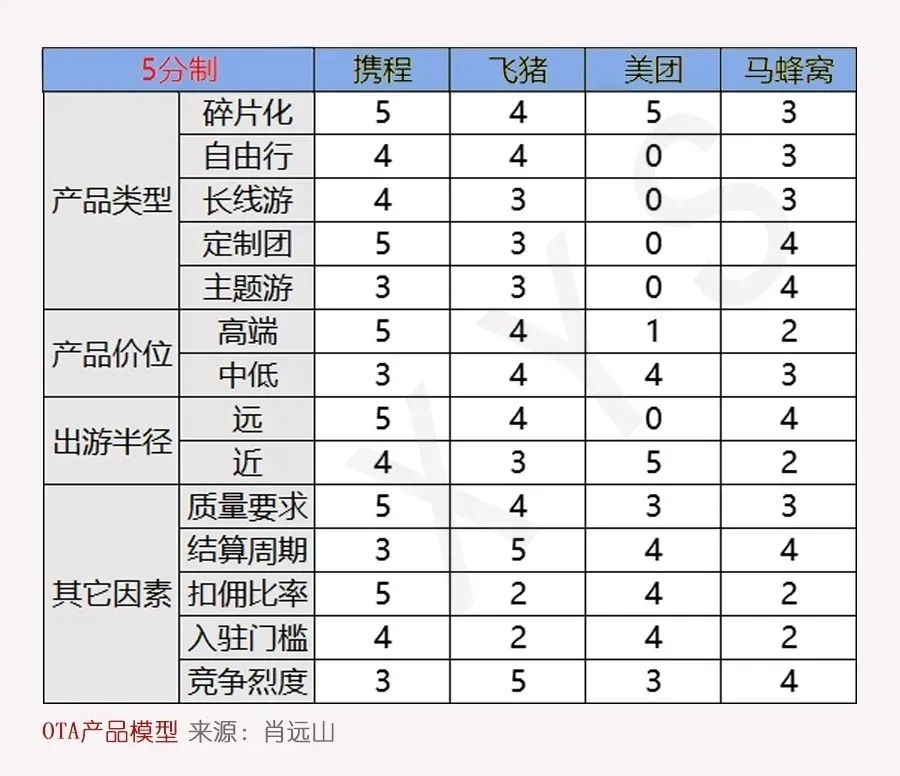我使用了5分制,分值越高说明这个细分OTA越适合,反之则越不适合,0分的就是做不了的。