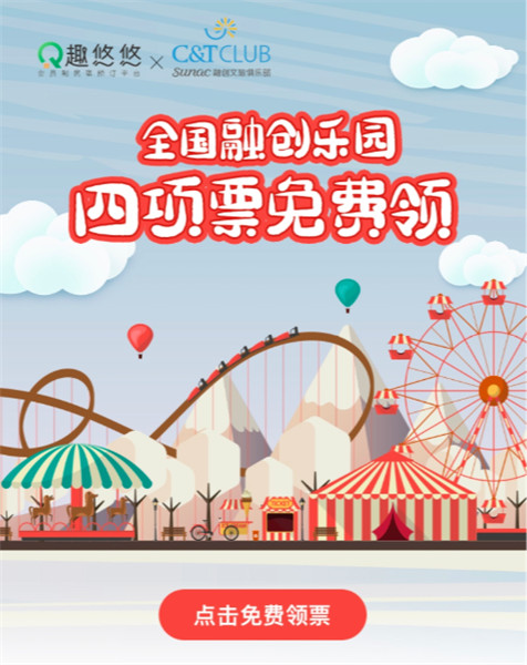 即日起,微信搜索“趣悠悠民宿预订”小程序,点击免费领票标签即享“全国融创乐园四项票免费领”。本次活动赠送价值88-180元的全国融创乐园游玩套票,领取和使用截止日为2021年2月28日。使用范围为融创文旅旗下:重庆融创乐园、成都融创乐园、无锡融创乐园、广州融创乐园、合肥融创乐园、南昌融创乐园和青岛融创乐园。