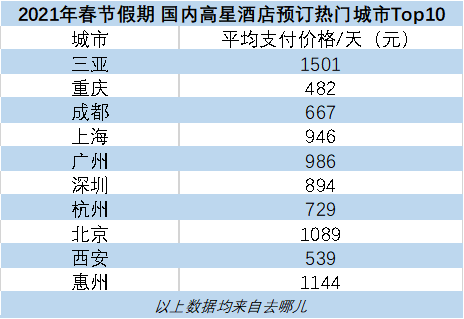 去哪儿数据显示,春节期间,三亚高星酒店预订量全国最高,每晚平均支付价格为1501元;北上广深四个一线城市的高星酒店预订量也进入Top10,其中北京高星酒店每晚平均支付价格为1089元。