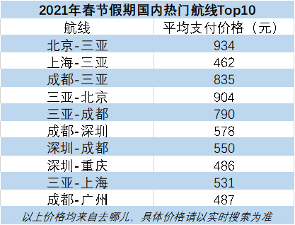 根据去哪儿发布的2021春节假期国内热门航线Top10来看,旅游航线和探亲航线并重,不仅有北京、上海和成都往返三亚的航线,也有成都-深圳、深圳-成都、深圳-重庆和成都-广州四条探亲线路,其中北京-三亚平均支付价格仅为934元,约为全价经济舱的2.7折。