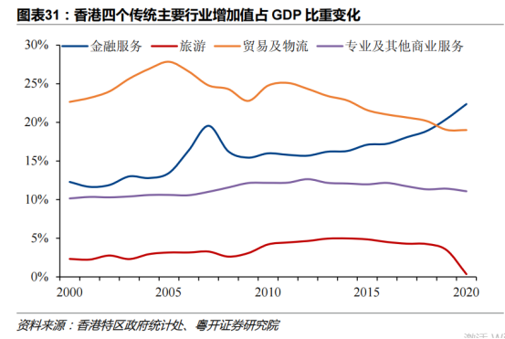 2004年之后,香港经济就告别了工业化时代的痕迹,形成了服务业GDP占比超九成的新结构。2019年香港GDP有一半以上,来自金融、旅游、贸易及物流、专业和商业服务四大行业。