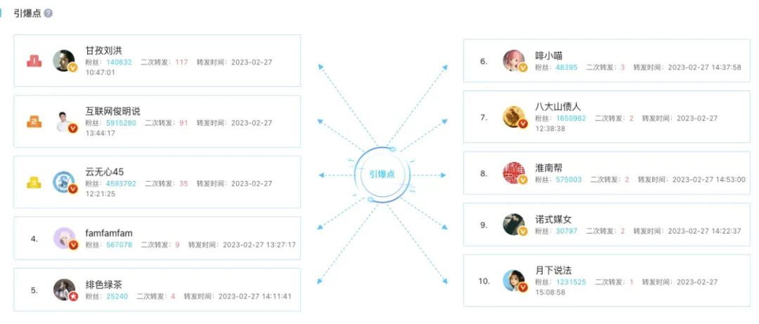 第二步,当地官方媒体@四川观察 、@人民日报等蓝V都在快速跟进,后续财经、视频、科技等不同领域的达人等也都对此发表了自己看法,进一步让事件热度升级。哪怕是千万级大V,个体力量终究难以引爆全网。在集中时间段,快速聚集核心传播力量,让刘洪的个体回应被更多人看到。