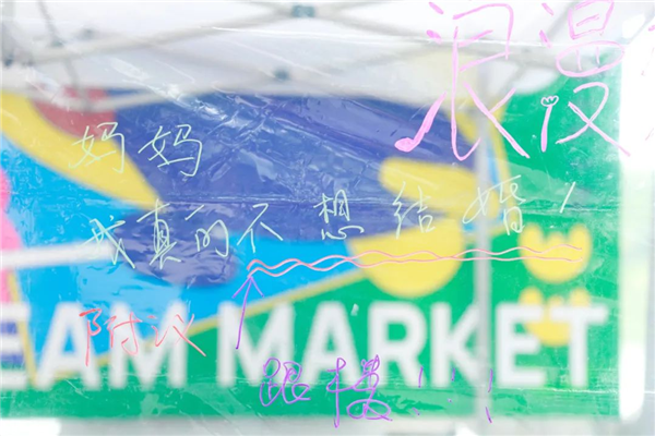 返回上海前一天,她专门抽时间来到“飞儿萌造梦市集”打卡体验,更是被市集特色摊位之一“复活诗歌计划”的主理人一首《一块红布》唱到当场飙泪,还在这个潮流市集上被无数年轻人在画布、明信片、留言墙上的小故事反复感动:“告诉妈妈,我不想结婚,别催我了”、“人生是可能性的合集”、“走出阴天,走进春天”……