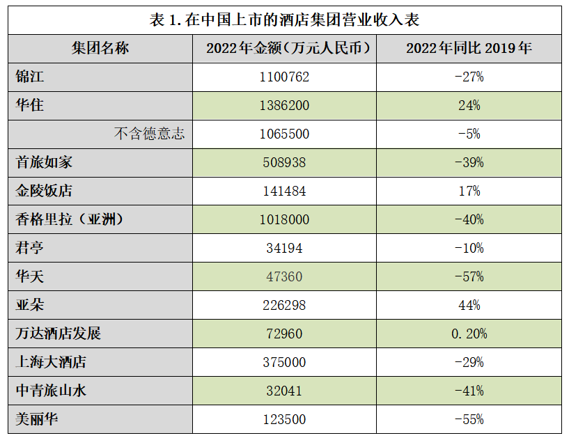 2022年这十二家酒店集团营业收入同比疫情前的2019年增加的有:金陵饭店17%、亚朵44%、万达酒店发展0.2%、华住24%。详见表1。