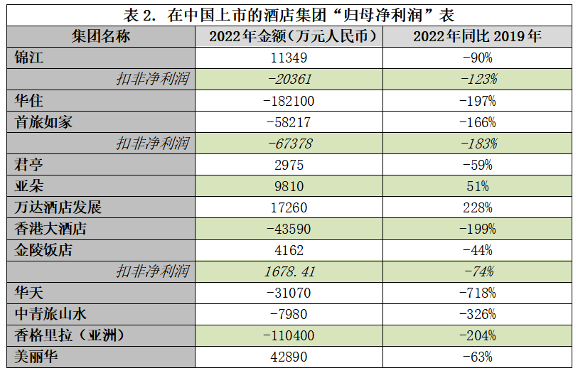 三年疫情持续重创下的2022年,归母净利润亏损的有六家分别是:华住-182100万元、首旅-58217万元、华天-31070万元、香港大酒店-43590万元、山水酒店-7980万元、香格里拉(亚洲)-110400万元;盈利的有六家:美丽华42890万元、万达酒店发展17260万元、亚朵9810万元、金陵饭店4162万元、君亭2975万元、锦江11349万元(归母扣非净利润-20361万元),详见表2。