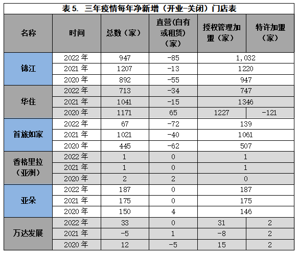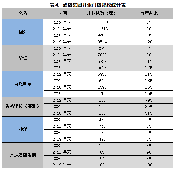 三年疫情的压力,加速了上市酒店集团轻资产步伐,各酒店集团的直营门店占开业总门店数量的比例逐年快速下降。锦江酒店、华住和首旅如家的直营门店数量占比,分别从2019年的12%、12%和19%,下降到2022年末的7%、8%和11%,详见表4。