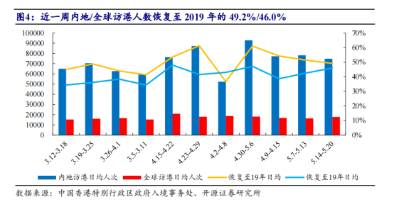 从上周(5.14-5.20)数据来看,内地访港旅客日均人数只恢复到2019年同期日均的49.2%,全球访客日均人数(除内地外)恢复至 2019 年日均的46%。