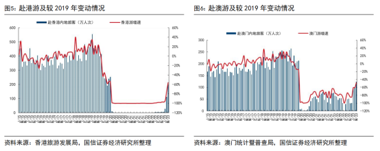 但值得注意的是,从内地游客的恢复度来看,五一期间澳门是远高于香港的:五一期间,内地赴中国香港游客恢复至2019年的56.13%,赴中国澳门的旅客恢复至 2019 年的75.51%。
