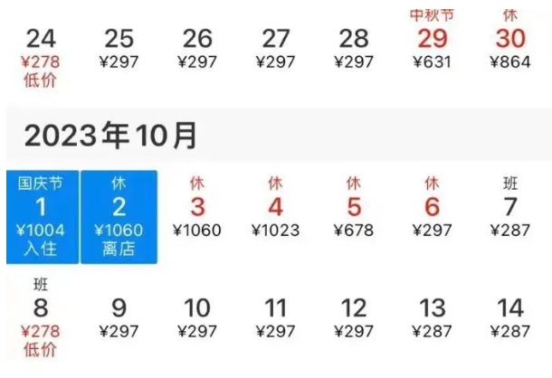 根据携程在线网络预订平台数据显示,杭州武林商圈某经济型酒店,高级大床房房型国庆假期最高参考价812元/晚,双休日(10月13日-15日)参考价266元/晚,跌落了近乎三倍的价格。重庆解放碑热门地段,某经济型酒店的价格从国庆首日1332元/晚的参考价跌落至333元/晚,价格降了1000元/晚。位于北京八达岭长城附近的某快捷酒店,在国庆期间上涨到了每晚2000元以上,然而现在又回落至每晚700元左右。据空间秘探观察,市场上超过八成的经济型酒店,“双节”前后价格相差2-4倍。