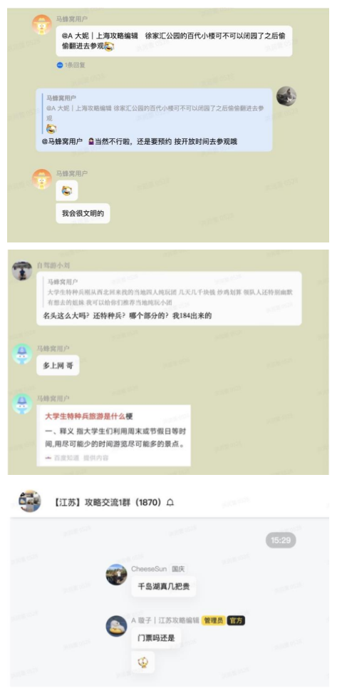 遇到群友的问题特别生僻,就连资深内容编辑一时解答不了时,后台编辑们会发动各种资源去打探。某个群友计划去一个海外目的地,想确认一下当地某个节庆活动是否正常举办。这个信息就连最资深的内容编辑都无法在网络上查到蛛丝马迹,后来这位资深内容编辑干脆找到这个国家在中国的旅游局负责人追问,这才拿到最准确的信息,引来群里一片“牛X”的惊呼。