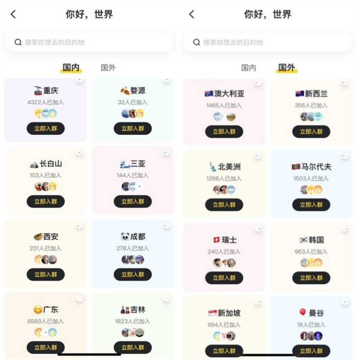 截至目前,马蜂窝平台上已经按照国家/地区,建立了近百个旅游目的地攻略群。目的地的颗粒度还在不断细化,从最初的国家/地区到省份、城市乃至景区。覆盖的年轻用户数量持续扩大,按照一个群满员千人计算,已经吸引数十万年轻活跃用户,而且还在以几何级数增长。