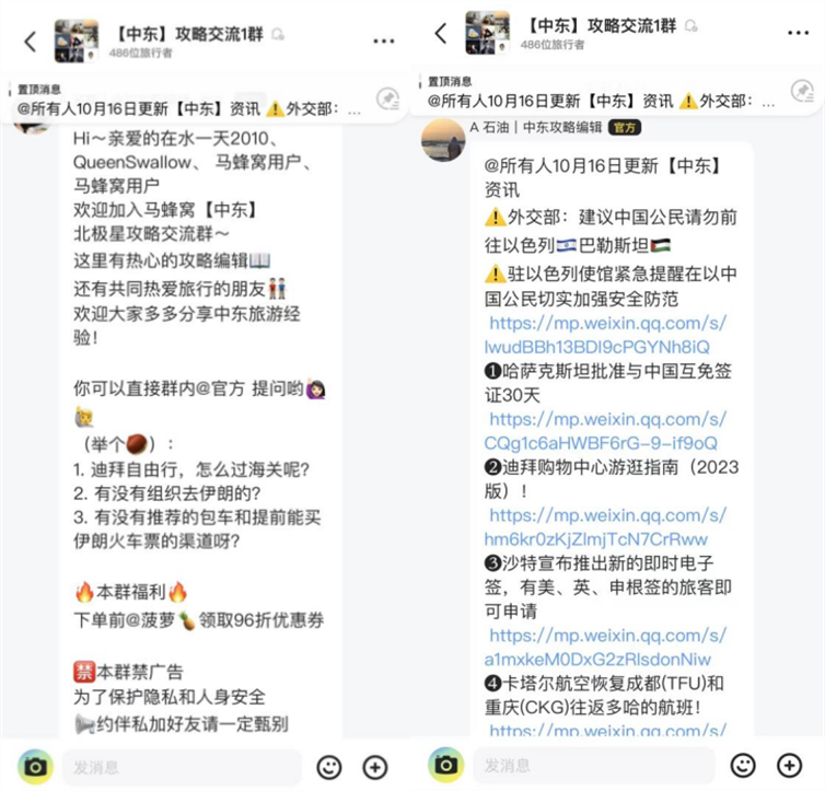 当群友希望群主推荐当地靠谱旅游商品时,后者也会适时将平台对应的旅游商品链接发到群里供对方参考,但日常不会主动刷旅游商品广告。群主每天另一项重要工作就是分享相关国家/区域一手的旅游资讯,遇到当地重要的节庆、平台折扣优惠等,也会第一时间分享给群友,但不会刻意去大肆发布营销宣传广告。