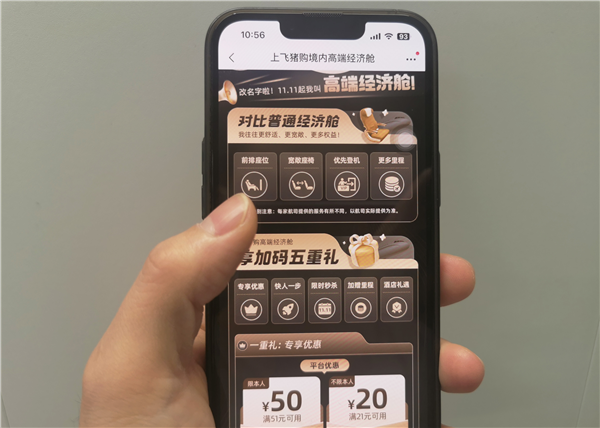 如果消费者预订的机票日期为元旦、春节等出行高峰期,高端经济舱与普通经济舱的价格则进一步逼近甚至持平。例如12月30日北京-深圳的南方航空CZ3194,其经济舱折扣价为1700元,明珠经济舱(即高端经济舱)折扣价也是1700元,头等舱/公务舱折扣价为2320元。如果消费者双11当天在飞猪上预订该高端经济舱机票,使用“满51元减50元”的高端经济舱专享券后还能比普通经济舱再便宜几十元,同时又可获得快速安检、飞猪里程、高星级酒店免费早餐等多项附加权益。