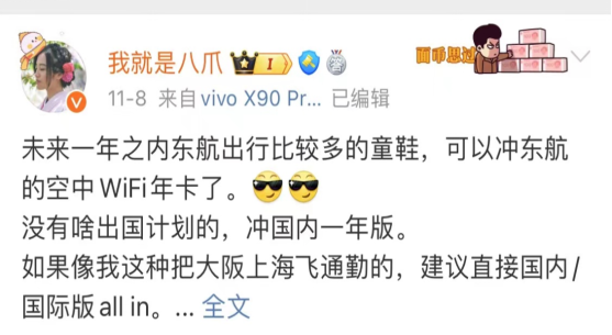 作为国内知名旅游达人,“我就是八爪”这次格外重视的这款“双11”新品既非热门“随心飞”,也不是骨折价的爆款目的地机票,更不是贵宾厅、升舱券等热门权益,而是一个看似很不起眼的新产品——空中WIFI年卡。