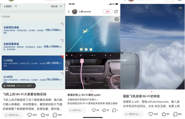 另一个明显标志就是,在微博、小红书等平台,晒出自己在飞行途中通过空中WIFI上网打卡图文/短视频的相关帖子悄然增加。