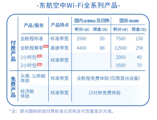 在资费方面,以东航空中WIFI日常价格为例,划分为免费和付费两大类产品。免费空中WIFI每位乘客都可以有10分钟的额度;国内及日韩付费空中WIFI全航程是50元,国际付费空中WIFI全航程是150元。