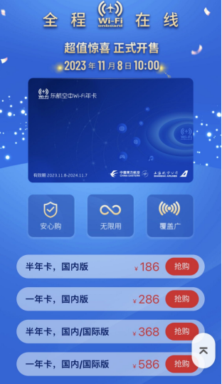 好在航司也很精明,今年东航就借“双11”推出空中WIFI半年卡和年卡产品,把空中WIFI的价格进一步压下来。根据东航规定,国内版半年卡/一年卡分别是186元/286元,国内/国际版半年卡/一年卡分别是368元和586元。