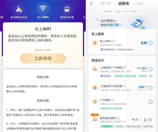 携程的金钻和黑钻会员在携程平台上订购东航和吉祥宽体机执飞的航班机票时,在机票主流程中的“选择服务”页面,出现了“免费的机上Wi-Fi”字样,点击后可以选择30分钟的免费使用空中Wi-Fi权益。根据携程的计划,每位黑钻和金钻会员在年内分别有12次和6次在东航和吉祥的飞机上免费使用空中Wi-Fi的机会,不管是国内还是国际航线都可以。