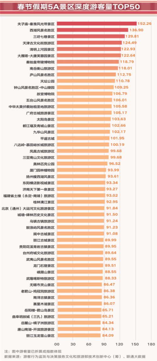 从游客量来看,春节假期期间深度游客量(在景区停留1小时以上的游客人数,本部分以下简称“深度游”)前50的景区共接待游客2132.1万人,平均每家景区深度游达42.6万人。夫子庙-秦淮风光带景区、西湖风景名胜区、三坊七巷景区、天津古文化街旅游区、清明上河园景区位列5A景区深度游客量前五位。