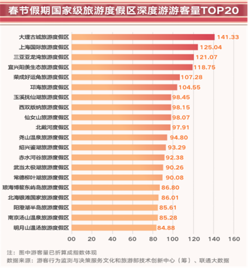 春节假期,全国63家国家级旅游度假区共接待深度游客(在度假区停留2小时以上的游客人数,本部分以下简称“深度游”)793.4万人,按可比口径较2023年增长了42.3%,增长显著。其中深度游前20的度假区共接待478.5万人,平均每家度假区接待23.9万人。大理古城旅游度假区、上海国际旅游度假区、三亚亚龙湾旅游度假区位列深度游客量前三位。
