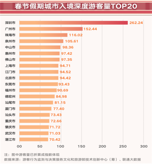 春节假期期间,136.6万人的入境深度游客(来自境外,并在大陆城市停留6小时以上的游客人数,以下简称“深度游”)的大数据样本显示,入境游客量前20的城市共接待入境深度游客87.0万人,平均每个城市接待约4.4万人。