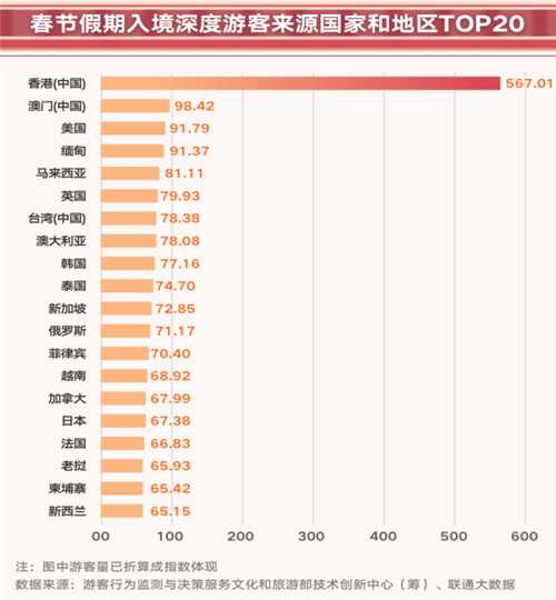 港澳台及东南亚入境游复苏显著。春节假期,从入境大数据样本来看,我国入境游客共来自179个国家和地区,其中入境游客量前20的国家和地区,涵盖了中国港澳台和8个东南亚国家。此外,美国、英国、加拿大、法国等欧美国家也进入了入境游客量前20。