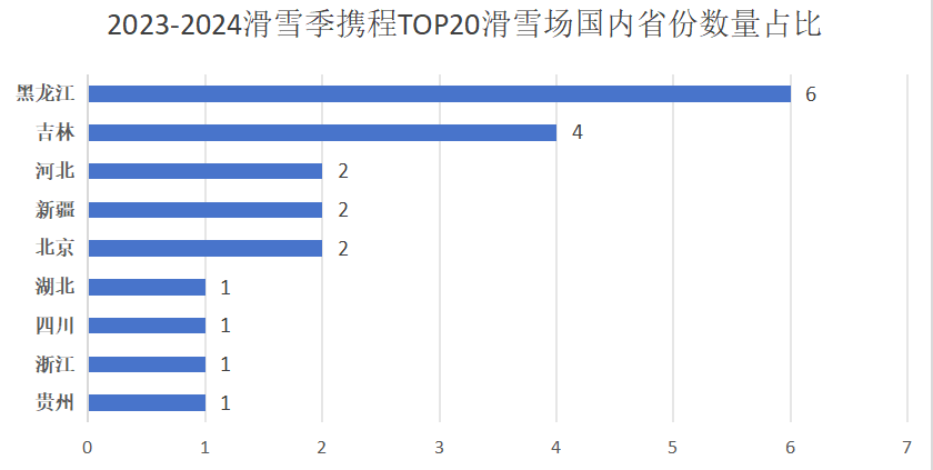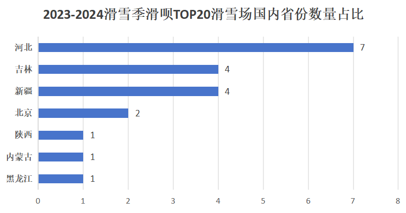 在TOP20的榜单中,六大省份出现明显分野,河北、吉林和新疆分别以7家、4家和4家滑雪场稳居前三;北京2家,黑龙江只有1家,且排名靠后,辽宁更是未能入围。