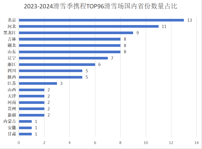 在国内最大OTA携程上,劲旅君按照“热度高→低”、“评分4.0分及以上”、“点评100条以上”的标准,筛选出TOP96的最受大众关注的户外滑雪类景区(滑雪场)榜单,并统计出各省滑雪场上榜数量: