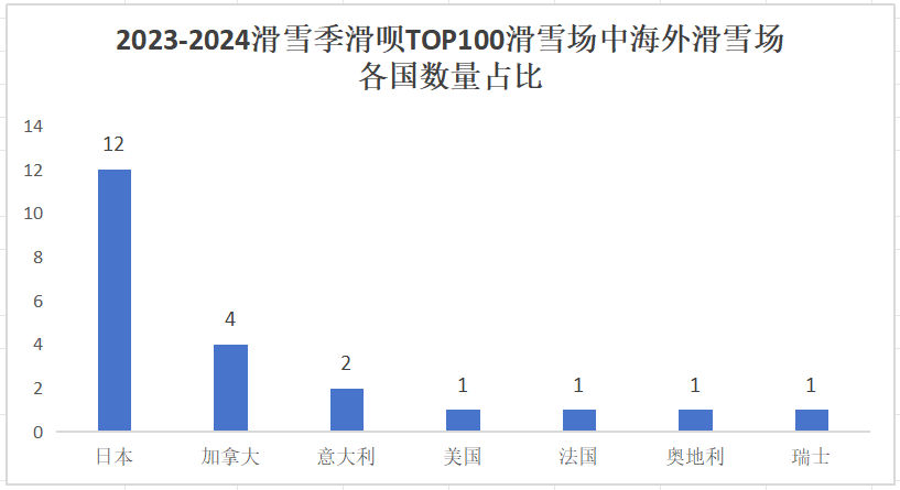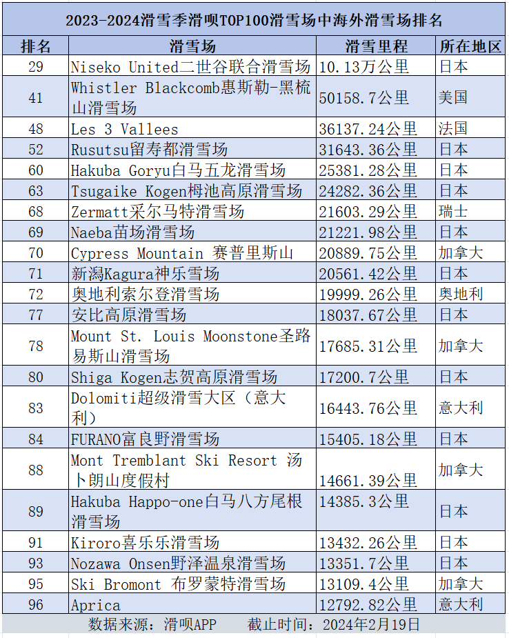 来自滑呗的统计显示,2023-2024滑雪季,TOP100榜单中上榜的海外滑雪场有22家: