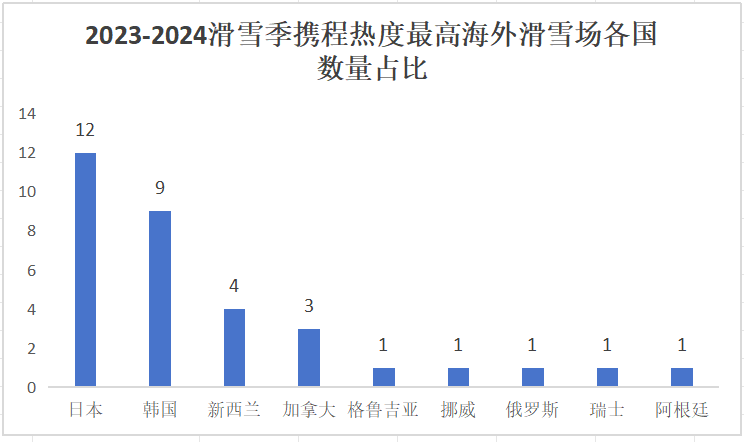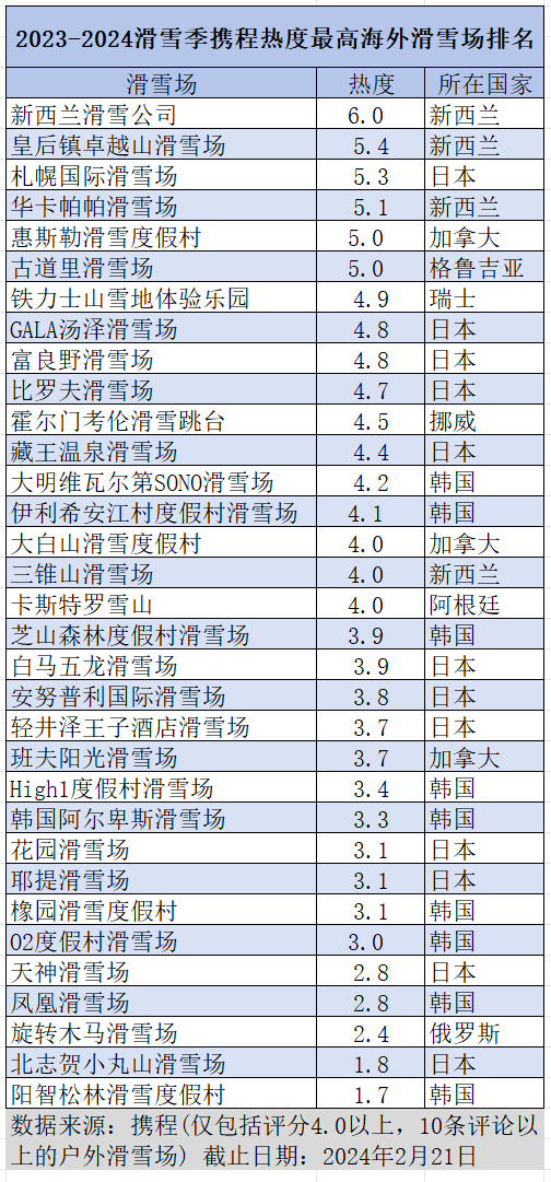 来自携程的统计显示,2023-2024滑雪季,按照“热度高→低”、“评分4.0及以上”、“点评10条及以上”搜索国外户外滑雪类景区(滑雪场),共计33家: