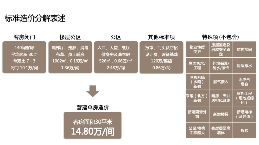 在140间客房的基础上,我们每间房的闭门造价是10.1万,楼层公区测算下来,在标准模型里,摊到每间房是1.36万,公区的造价,摊到每间房是2.46万/间,其他标准项,是0.86万一间,合起来大概是14.8万/间。另外加上我们开业前准备的运营物品,最终是15.43万/间。