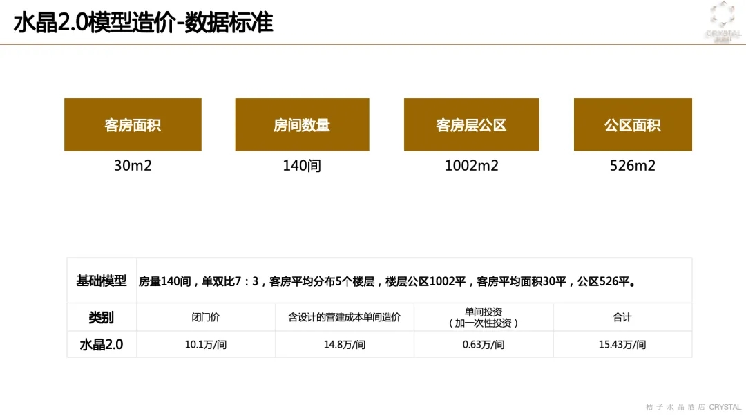 其次,具体到桔子水晶2.0,也有非常标准的造价模型。目前造价模型中,达到开业状态(包含运营物品)的总成本是15万左右,每间房的平均成本约为14.8万。