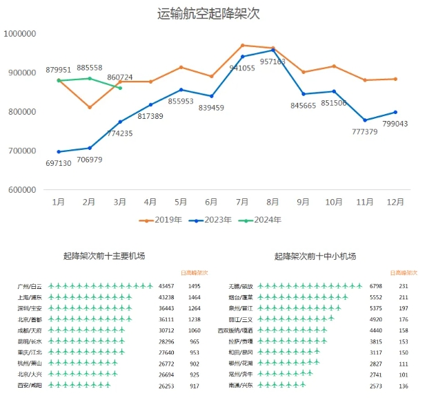 1-3月,机场管制保障总起降架次较2019年同期增长1%。