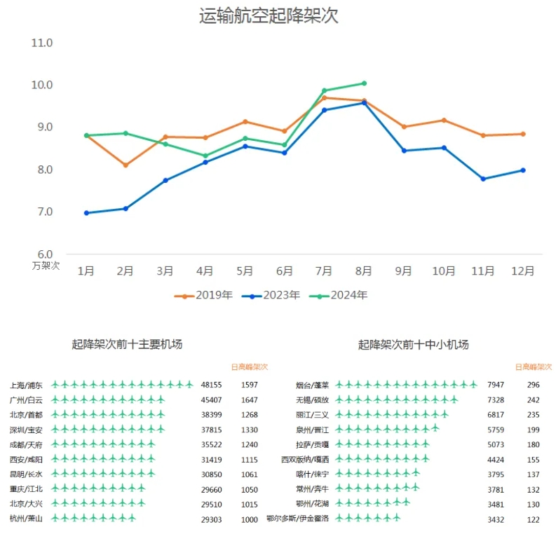 9月11日,民航空管发布2024年8月运行统计公报。2024年8月份,机场管制保障总起降115万架次,同比增长1.70%,其中保障运输航空起降100万架次,同比增长4.88%。2024年1-8月,机场管制累计保障总起降829万架次,同比增长4.59%,较2019年同期增长4.44%。其中累计保障运输航空起降718万架次,同比增长9.01%。
