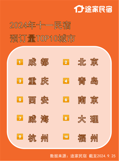 今年十一假期,热门城市民宿预订量同比去年小幅上涨,预订价格同比便宜两成。截至9月25日,途家平台十一期间热门城市TOP10为成都、北京、重庆、青岛、西安、南京、威海、大理、杭州和福州。其中,南京凭借红山动物园、秦淮河、夫子庙等热门景区,成为民宿黑马城市,首次跻身十一预订TOP10,预订量比去年增长40%。