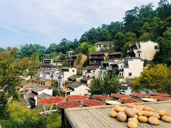 “篁岭一晒,便已知秋。”水墨画般的徽派建筑,搭配辣椒、皇菊、稻谷、柿子等农产品点缀在晒秋人家的屋顶,五彩斑斓,是最美的丰收图。上海的李霞早早预订了篁岭的民宿,“十一我不想特种兵旅行了,只想去看看秋景,晒掉一身班味儿。”