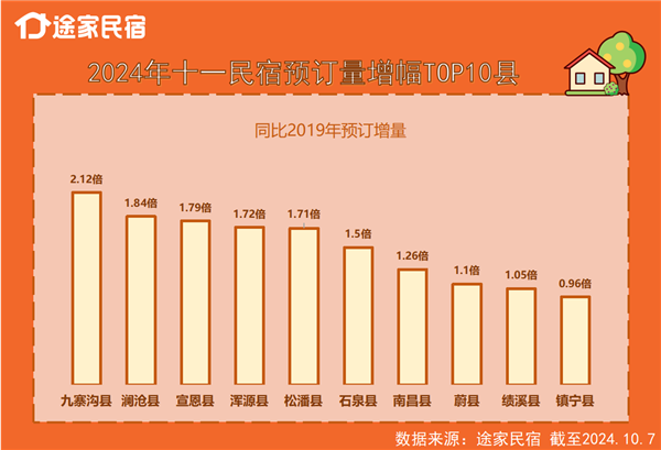 从十一县域民宿预订增速看,四川九寨沟县预订量同比增长1.8倍,排名第一,云南澜沧县、湖北宣恩县、山西浑源县、四川松潘县、陕西石泉县、江西南昌县、河北蔚县、安徽绩溪县和贵州镇宁县分列二到十位,预订增速均超九成。