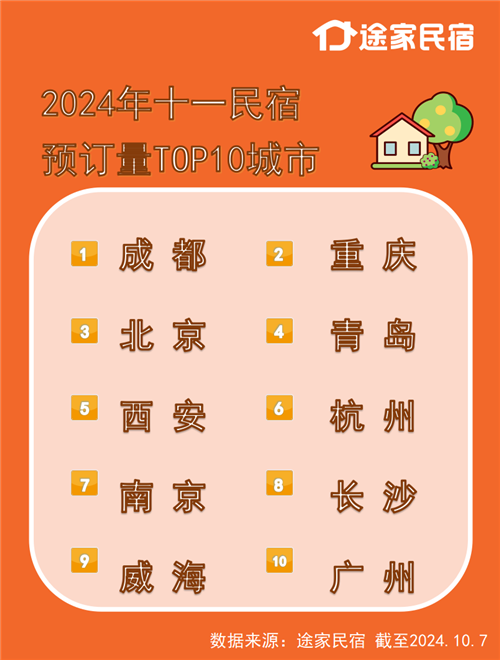 途家平台上,民宿预订热门目的地TOP10为成都、重庆、北京、青岛、西安、杭州、南京、长沙、威海和广州。