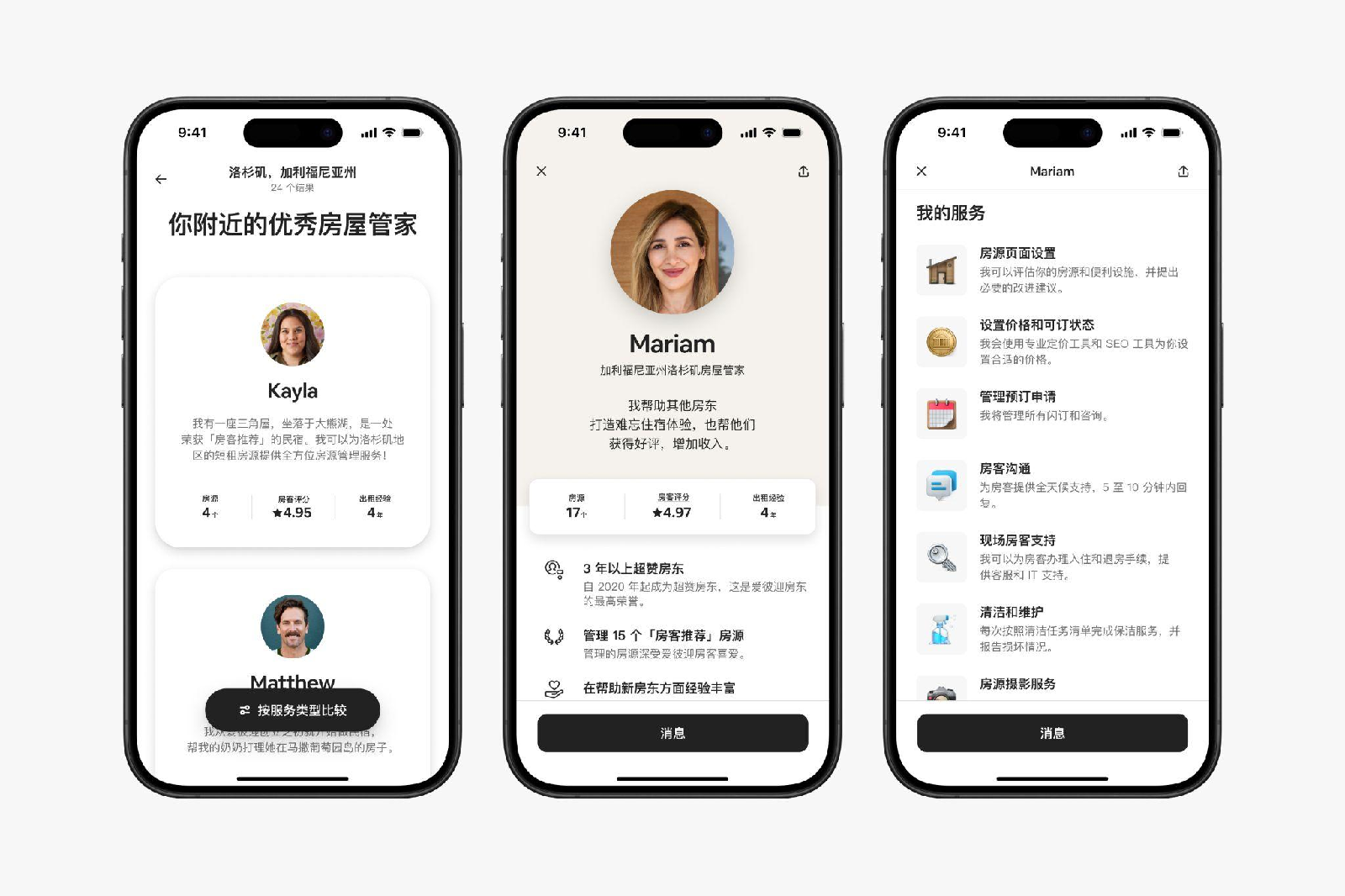 房屋管家通常拥有丰富经验和出色的运营记录。爱彼迎数据显示,73%的房屋管家是爱彼迎“超赞房东”,84%的房屋管家运营着至少一套“房客推荐”房源。在爱彼迎平台,房屋管家的平均评分高达4.86分(满分5分),而房屋托管团队的平均评分仅为4.62分。在全球首发的10个市场,爱彼迎房东可以通过平台的个性化排名算法,从超过10000名房屋管家中轻松匹配可靠伙伴。