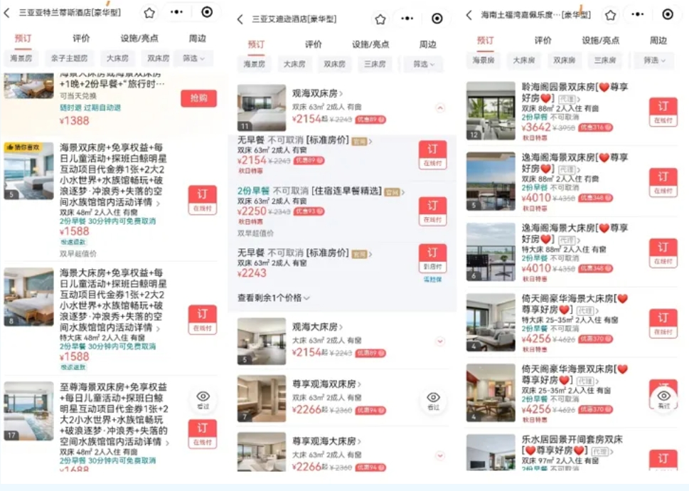 比如三亚艾迪逊酒店,2024年10月中旬的普通客房价格在2500元/晚,而它的价格在2020年10月中旬普通客房的价格在5000-7000元/晚,2023年10月中旬的价格在4000-5000元/晚;而三亚嘉佩乐酒店2024年10月中旬的普通客房价格在3500元/晚,俨然已经成为三亚豪华酒店的顶流。