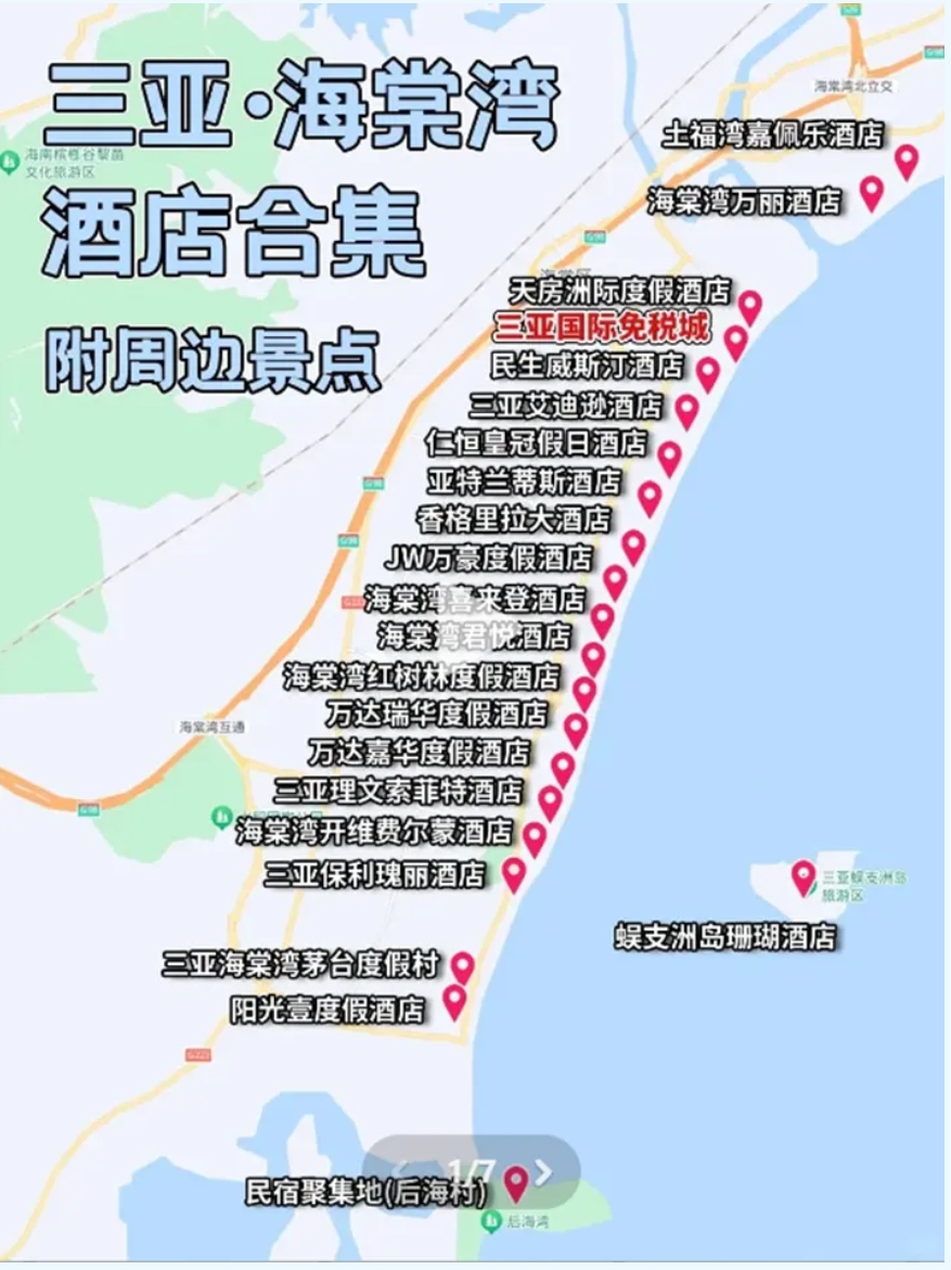 资本的大量进入,布局高端度假酒店,高端客房数量激增,可以看到下图海棠湾片区的酒店分布,高端酒店密集分布,本来王不见王的格局,已经变成了遍地高奢酒店,任何事物一旦聚集过多,稀缺就变得稀松平常,原有的客户就不够分了。叠加后续的需求不足,竞争必然加剧,降价厮杀就成为必然。