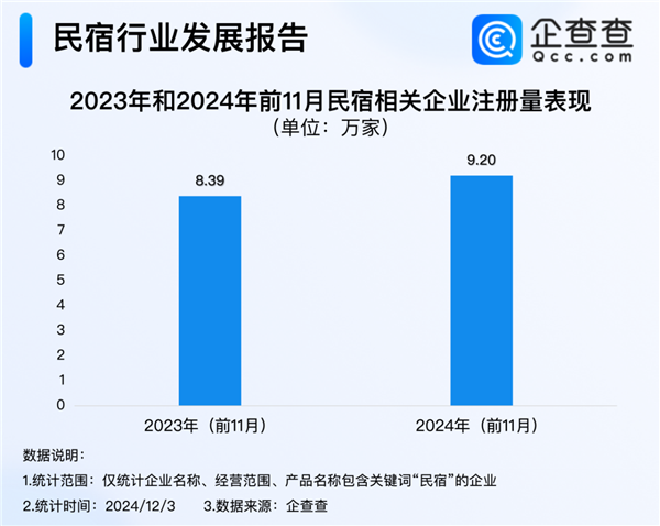 企查查数据显示,2024年前11个月,我国已注册9.20万家民宿相关企业,已超2023年全年,相比2023年同期的8.39万家,增加9.8%。