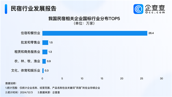 企查查数据显示,我国现存31.6万家民宿相关企业,主要集中住宿和餐饮业,有26.4万家,占比83.9%;归属批发和零售业、租赁和商务服务业的企业,分别有1.5万家、1.3万家,分占4.7%、4.0%。